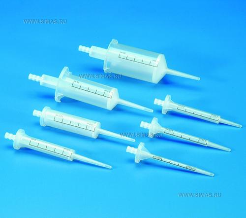 Одноразовые шприцы-дозаторы «наконечники для дозаторов» из полипропилена, объемом 0,05 – 0,50 – 1,25 – 2,50 – 5,00 – 12,50 – 25,00 – 50,00 мл. Предназначены для различных ступенчатых дозаторов/разбавителей с волюметрическим поршнем и градуировкой. Поставляются стерилизованными во множественной упаковке и стерилизованными – в индивидуальной. По заявке предоставляется сменный переходник из полипропилена для изделий объемом 25 и 50 мл. В упаковку изделий объемом 25 и 50 мл входит соответствующий переходник. Наконечники дозаторов совместимы с дозаторами Eppendorf Multipette ®, Brand HandyStep®, Kartell Dosijet.