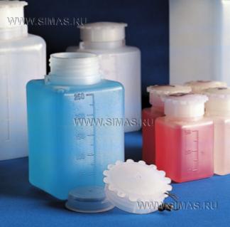 Градуированные бутылки общего назначения, соответствующие требованиям к продовольственным товарам и лекарствам. Широкое горло для удобства наполнения и опорожнения; подходят как для жидких, так и для порошкообразных веществ. Горло и резьба соответствуют стандартам DIN 13316 и 168.