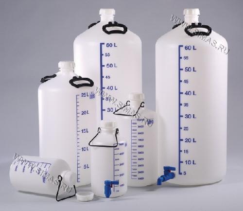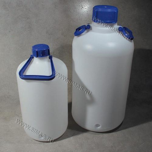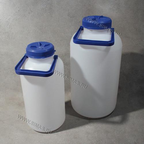 Описание: Изготовлены из полиэтилена высокой плотности. Белая бутыль с черной крышкой и черной ручкой около горловины. Горловина широкая.