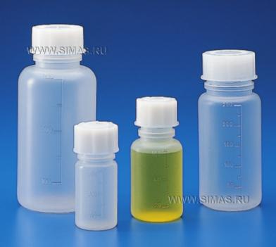 Градуированные бутылки общего назначения, соответствующие требованиям к продовольственным товарам и лекарствам. Широкое горло для удобства наполнения и опорожнения; подходят как для жидких, так и для порошкообразных веществ. Горло и резьба соответствуют стандартам DIN 13316 и 168.