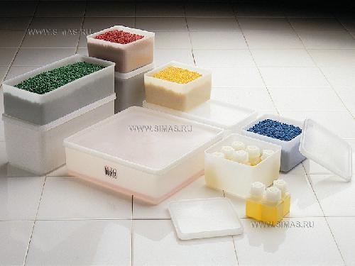 Контейнеры для хранения, упаковки, отбора проб, образцов и транспортировки паст, гранулятов, порошков, проб грунта и замороженных продуктов (-40°C кратковременно до +95°C). Оптимальное использование площадей, можно штабелировать. В комплекте с прижимающимися крышками.