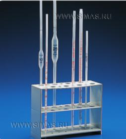 Предназначен для пипеток различных размеров. Вмещает 7 пипеток в длину (диаметром не больше 20 мм) или 16 пипеток в ширину (диаметром не больше 10 мм). Очень удобная подставка, которую можно использовать не только для пипеток.