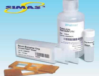 Чип представляет собой тест-систему антитела с единичным захватом встроенным на пластинку с двойной подложкой FAST Slide. Каждое стекло имеет две идентификационные тест-системы с антителами запечатанными в трех экземплярах. Двухцветная флуоресцентная система обнаружения позволяет сравнить “молекулярный отпечаток” 120 белков человеческой сыворотки с двумя образцами, такими как образцы сыворотки от больных особей и здоровых особей. Набор чипа биомаркировки сыворотки включает в себя два слайда с двойной подложкой. Две инкубационные камеры, промывочное и блокирующие буфера белковой тест-системы Уатман. Держатель слайда и реагенты маркировки/определения предлагаются отдельно. Чип может быть просканирован любыми стандартными флуоресцентыми сканерами.